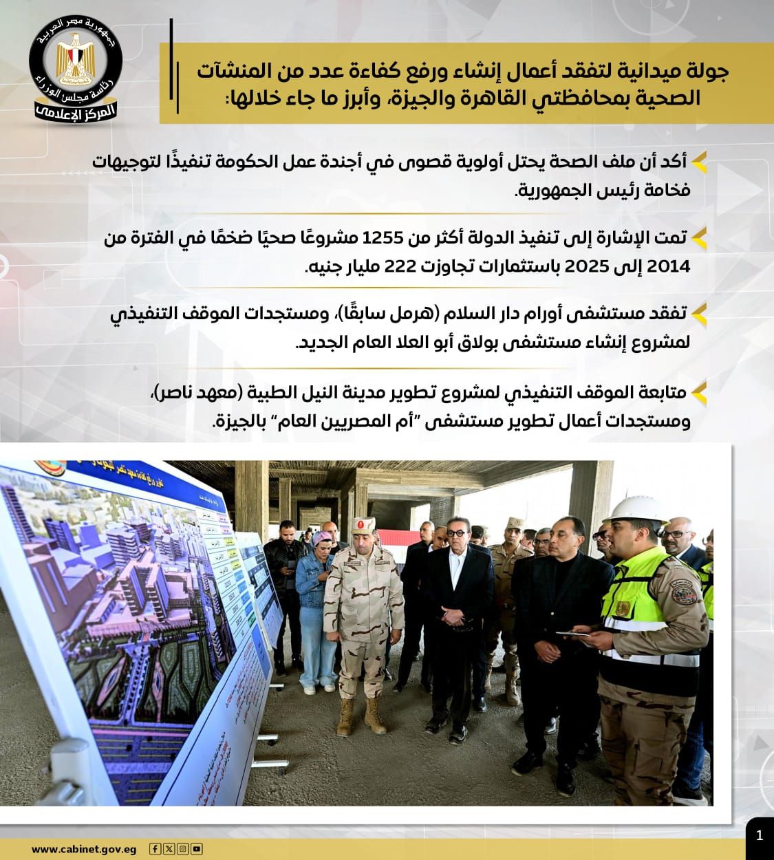 وتضمنت الأنشطة، جولة ميدانية أجراها رئيس الوزراء، لتفقد أعمال إنشاء ورفع كفاءة عدد من المنشآت الصحية بمحافظتي القاهرة والجيزة، أكد خلالها أن ملف الصحة يحتل أولوية قصوى في أجندة عمل الحكومة تنفيذًا لتوجيهات فخامة رئيس الجمهورية، وتمت الإشارة إلى تنفيذ الدولة أكثر من 1255 مشروعًا صحيًا ضخمًا في الفترة من 2014 إلى 2025، باستثمارات تجاوزت 222 مليار جنيه.