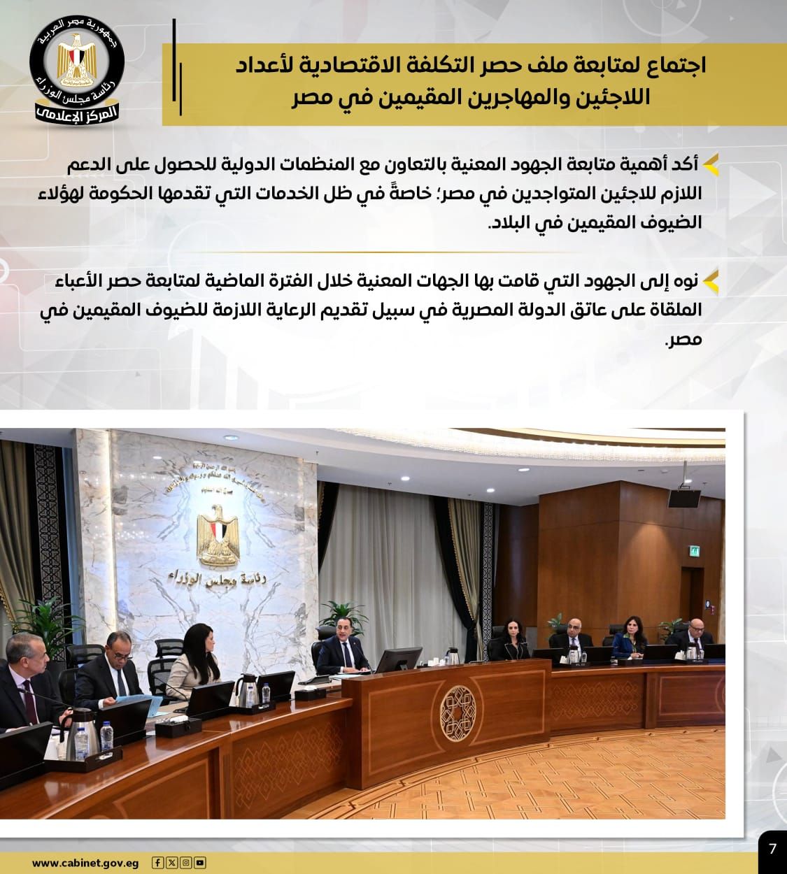 كما عقد رئيس الوزراء اجتماعًا لمتابعة ملف حصر التكلفة الاقتصادية لأعداد اللاجئين والمهاجرين المقيمين في مصر، أكد خلاله أهمية متابعة الجهود المعنية بالتعاون مع المنظمات الدولية للحصول على الدعم اللازم للاجئين المتواجدين في مصر؛ خاصةً في ظل الخدمات التي تقدمها الحكومة لهؤلاء الضيوف المقيمين في البلاد.