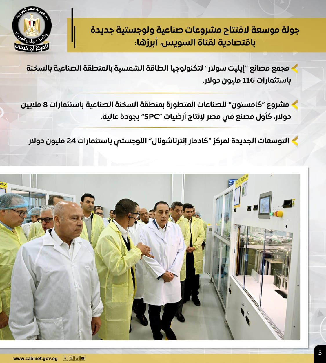 كما أجرى رئيس الوزراء جولة موسعة لافتتاح مشروعات صناعية ولوجستية جديدة بـ "اقتصادية قناة السويس"، أبرزها افتتاح مجمع مصانع "إيليت سولار" لتكنولوجيا الطاقة الشمسية بالمنطقة الصناعية بالسخنة باستثمارات 116 مليون دولار.