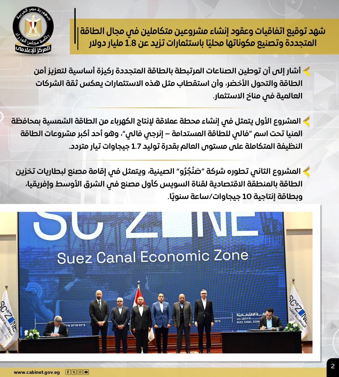 وشهد رئيس الوزراء توقيع اتفاقيات وعقود إنشاء مشروعين متكاملين في مجال الطاقة المتجددة وتصنيع مكوناتها محليًا باستثمارات تزيد عن ١.٨ مليار دولار، مشيرًا إلى أن توطين الصناعات المرتبطة بالطاقة المتجددة ركيزة أساسية لتعزيز أمن الطاقة والتحول الأخضر، وأن استقطاب مثل هذه الاستثمارات يعكس ثقة الشركات العالمية في مناخ الاستثمار.