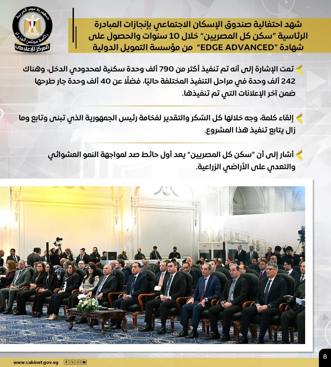 كما شهد رئيس الوزراء احتفالية صندوق الإسكان الاجتماعي بإنجازات المبادرة الرئاسية "سكن كل المصريين" خلال 10 سنوات والحصول على شهادة "EDGE ADVANCED" من مؤسسة التمويل الدولية، وألقى كلمة وجه خلالها كل الشكر والتقدير لفخامة رئيس الجمهورية الذي تبنى وتابع وما زال يتابع تنفيذ هذا المشروع، وأشار إلى أن "سكن كل المصريين" يعد أول حائط صد لمواجهة النمو العشوائي والتعدي على الأراضي الزراعية.