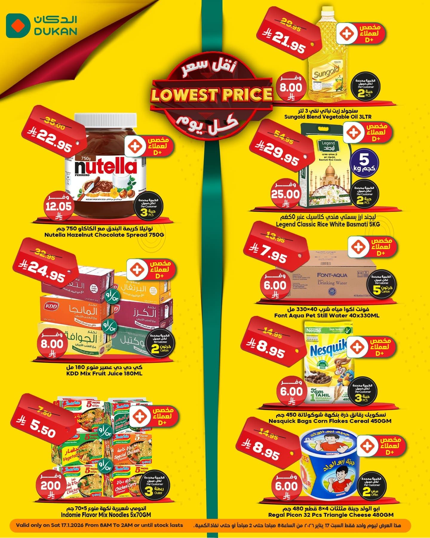 عروض الدكان جدة السبت 17 يناير 2026 – 28-7-1447هـ بتقدم ليكم تشكيلة من المنتجات المتنوعة منها الزيوت و الارز البسمتي فولت اكوا مياه و ايضا بتوفر نسكويك رقائق و غيرها من المنتجات المختلفة و باسعار مميزة متاحة اليوم فقط ابقوا معنا ليصلكم كل جديد عن عروض السعودية