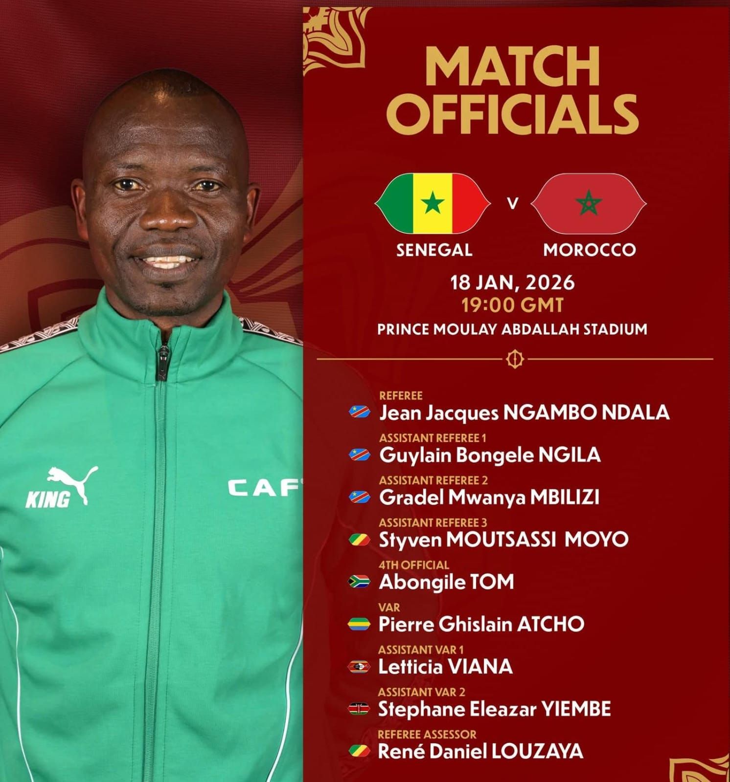 أعلن الاتحاد الأفريقي لكرة القدم "كاف" تكليف الدولى الكونغولي جان جاك ندالا بإدارة نهائي أمم أفريقيا 2025 في نسخته الـ35 المرتقب بين منتخبي المغرب والسنغال والتي ستقام اليوم الأحد بملعب "مولاي عبد الله" بالعاصمة المغربية الرباط.