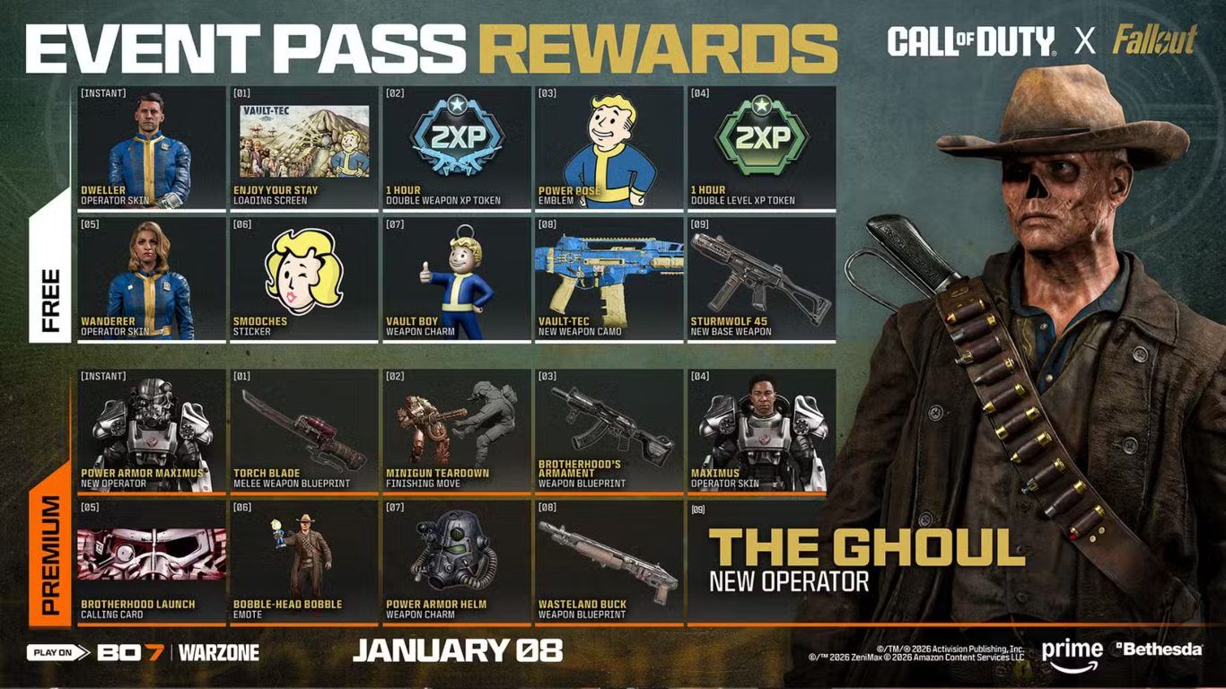 يشمل Fallout Event Pass عددا أكبر من المكافآت حيث يحتوي على 3 Operator Skins إضافية من بينها زي يتم فتحه بشكل فوري عند الشراء إلى جانب 3 Weapon Blueprints وعناصر تجميلية متعددة تشمل Emotes و Calling Cards و Weapon Charms وغيرها من المكافآت المرتبطة بحدث Fallout.