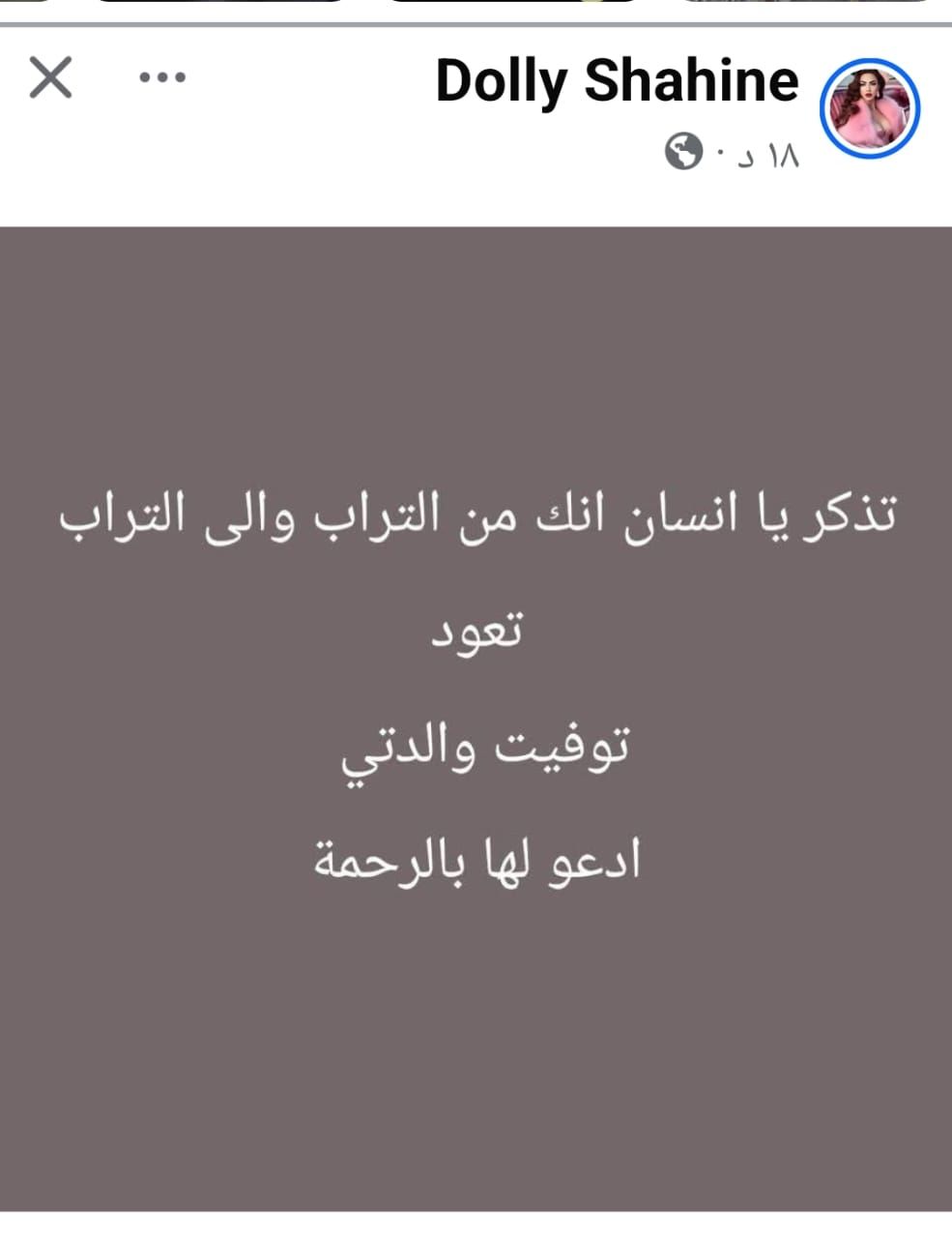 أعلنت الفنانة دوللى شاهين وفاة والدتها، حيث علقت على صفحة الفيس بوك قائلة: تذكر ياانسان انك من التراب وإلى التراب تعود، توفيت والدتى ادعو لها بالرحمة .