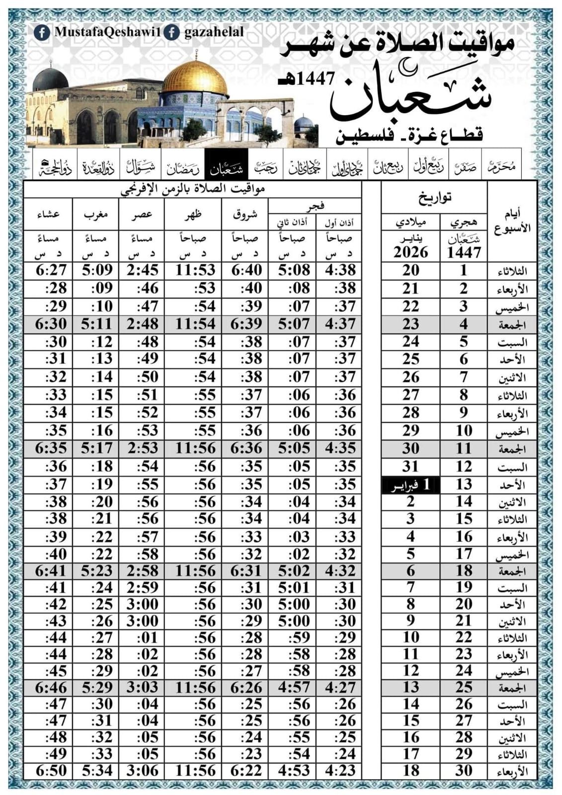 إمساكية شهر شعبان 1447/2026 غزة - فلسطين