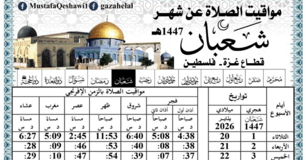 مواقيت الصلاة لغرة شعبان 1447 في قطاع غزة