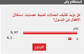 وأيد 97% من القراء مطالب تكثيف الحملات لضبط عصابات استغلال الأطفال فى التسول، بينما عارض 3% من القراء مطالب تكثيف الحملات لضبط عصابات استغلال الأطفال فى التسول.