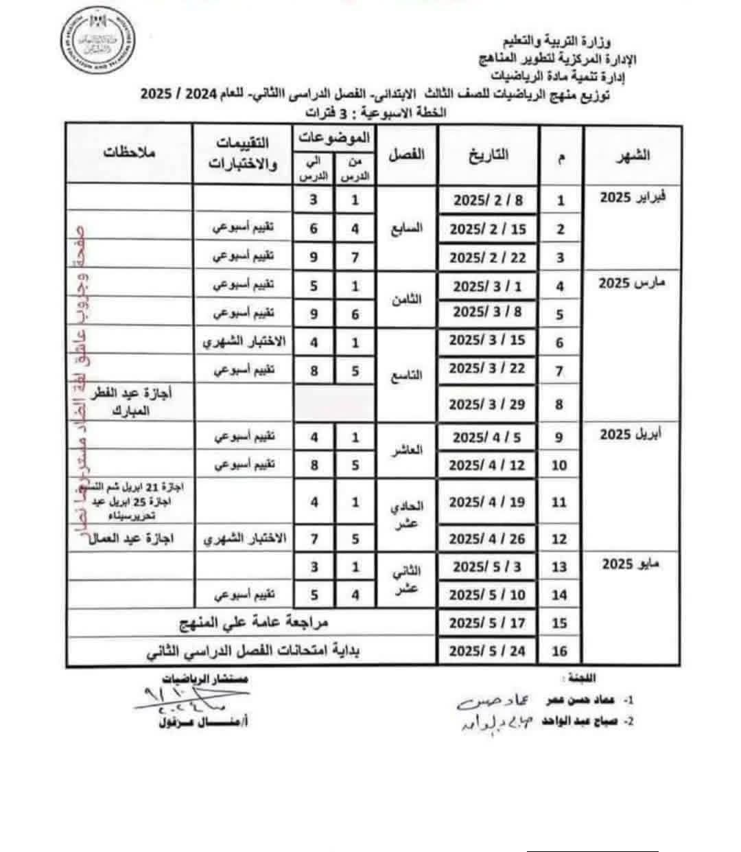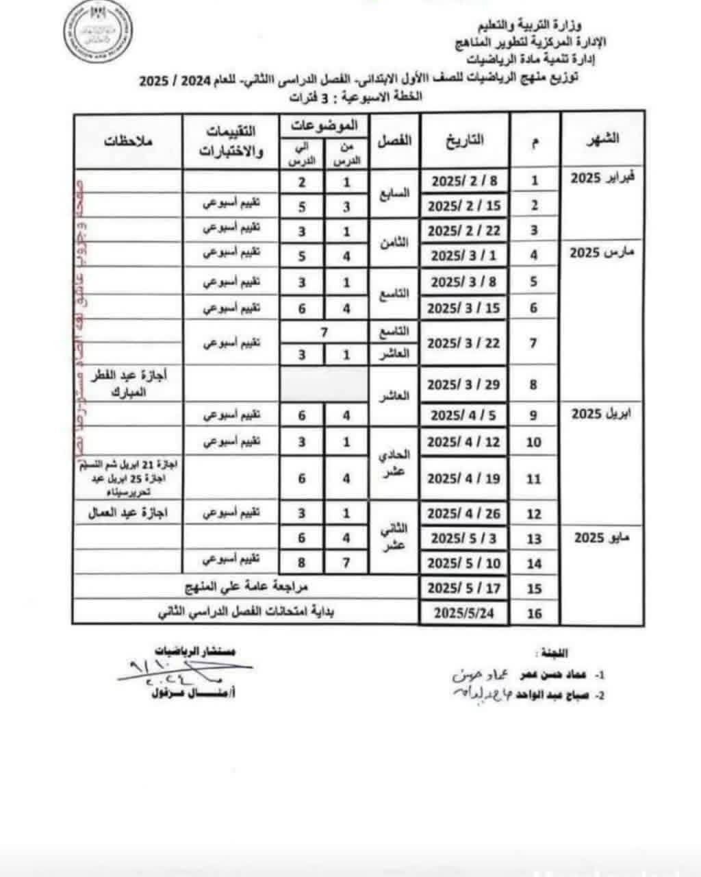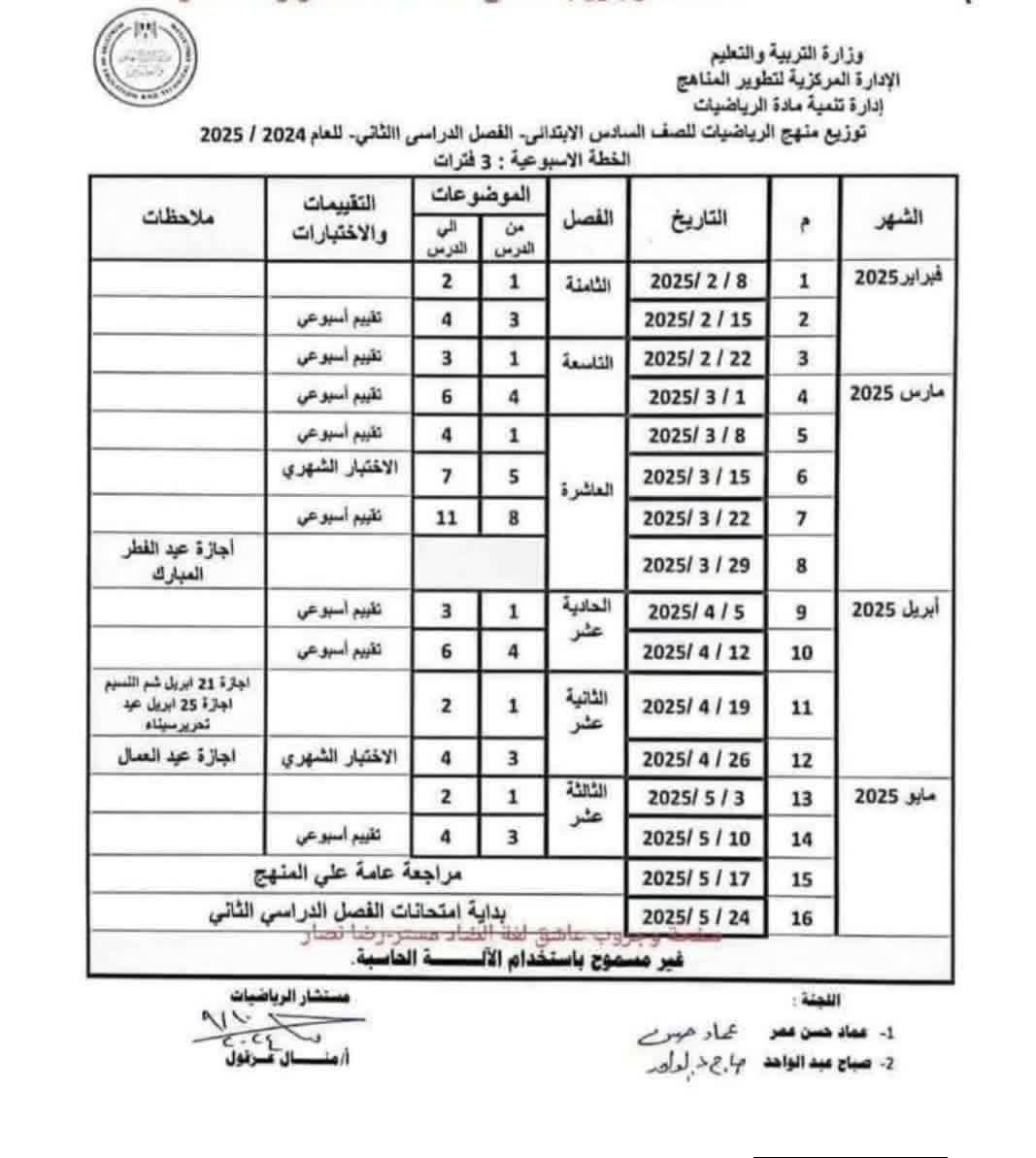 توزيع المنهج خلال شهور فبراير ومارس وابريل ومايو