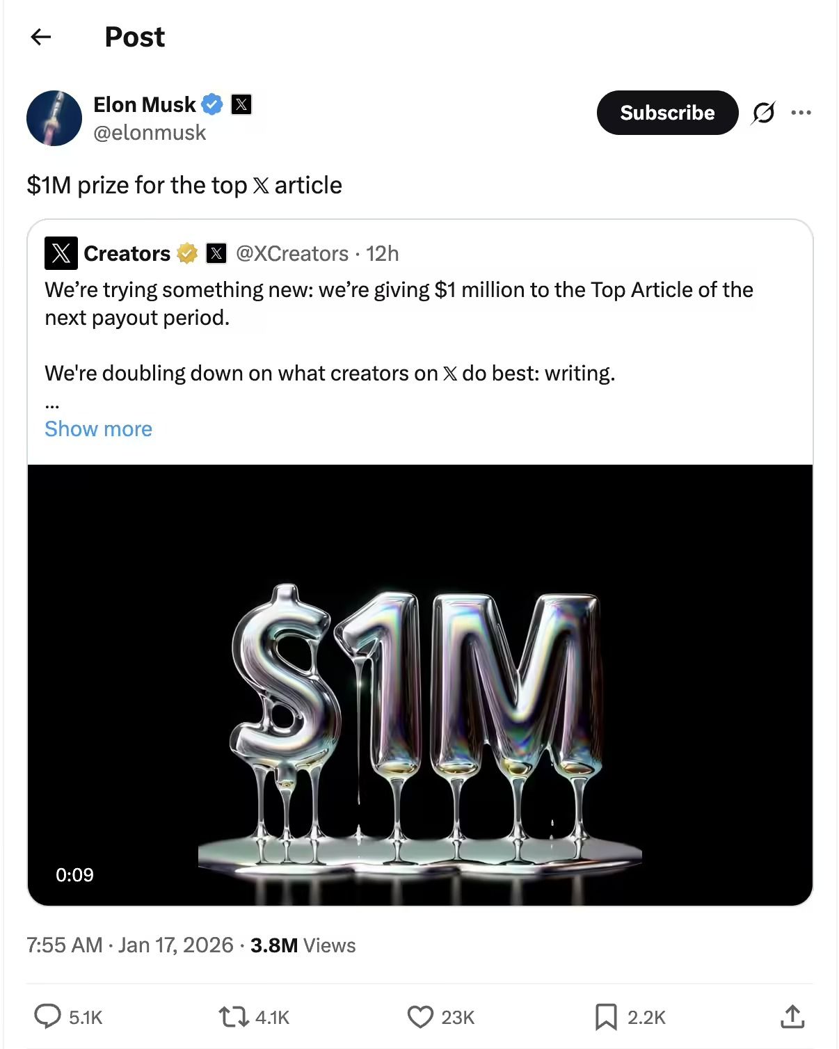 جاء في نص المنشور الرسمي لحساب X Creators:«نحن نجرب شيئًا جديدًا: سنمنح مليون دولار لأفضل مقال في فترة المدفوعات المقبلة، نحن نضاعف تركيزنا على ما يبدع فيه صناع المحتوى على X: الكتابة، في عام 2026، هدفنا هو تكريم المحتوى عالي القيمة وعالي التأثير الذي يشكّل الحوار، ويكشف الأخبار، ويحرّك الثقافة».