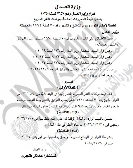 الثلاثاء، 20 يناير 2026 09:57 صنشرت الجريدة الرسمية اليوم نص قرار المستشار عدنان فنجرى وزير العدل بتحديد قيمة رسوم التوثيق والشهر بالمحررات الخاصة بمركبات النقل السريع، تطبيقًا لأحكام قانون رسوم التوثيق والشهر رقم 70 لسنة 1964 وتعديلاته.