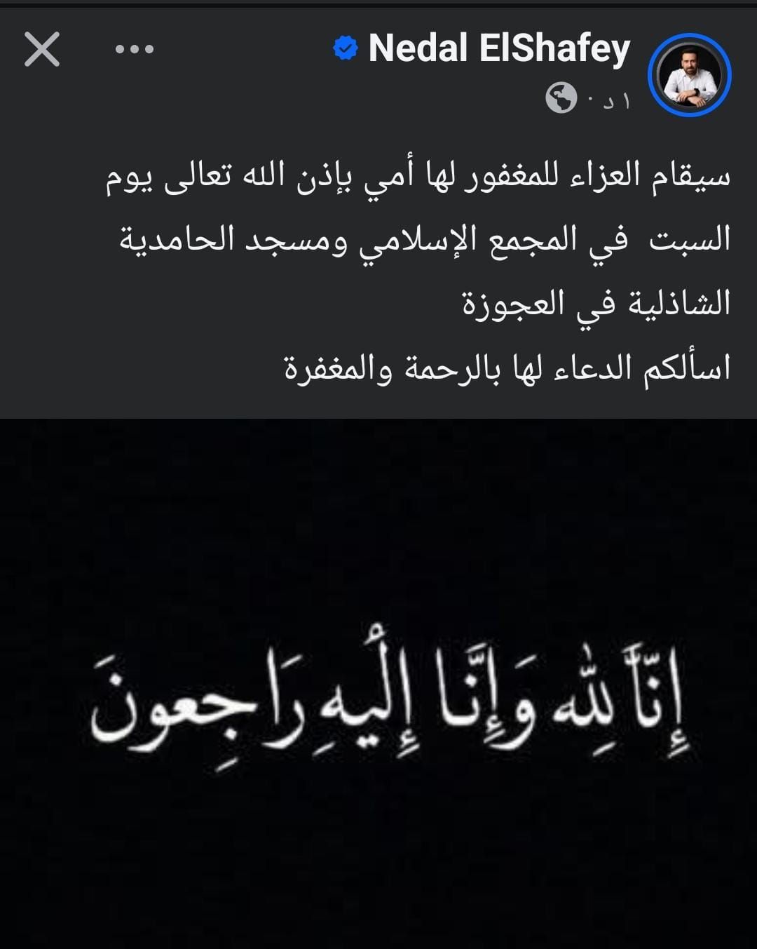 يستقبل النجم نضال الشافعي عزاء والدته الراحلة السبت المقبل بمسجد الحامدية الشاذلية في الجيزة، حيث نشر بوست عبر حسابه الشخصي بموقع فيس بوك، وكتب: سيقام العزاء للمغفور لها أمي بإذن الله تعالى يوم السبت في الحامدية الشاذلية في العجوزة، أسألكم الدعاء لها بالرحمة والمغفرة.