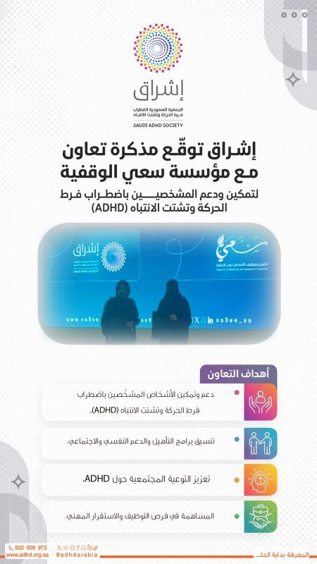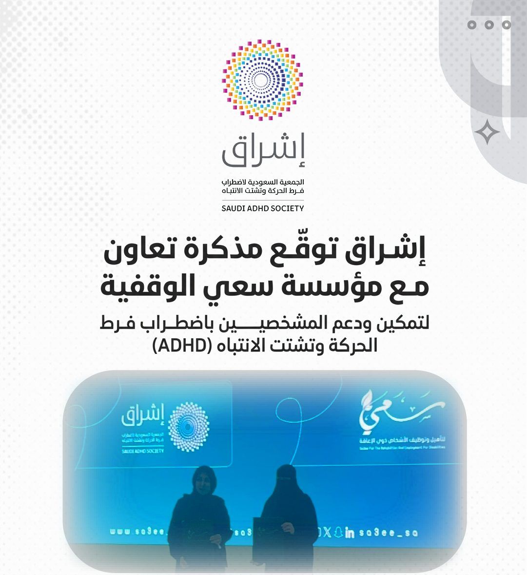 وقّعت الجمعية السعودية لاضطراب فرط الحركة وتشتت الانتباه (جمعية إشراق) مذكرة تعاون مشترك مع مؤسسة سعي الوقفية لتأهيل وتوظيف الأشخاص ذوي الإعاقة، وذلك في مدينة الرياض، في خطوة استراتيجية تهدف إلى تعزيز التكامل بين الجانبين وتوسيع أثر البرامج الاجتماعية والتنموية المقدمة للمستفيدين.