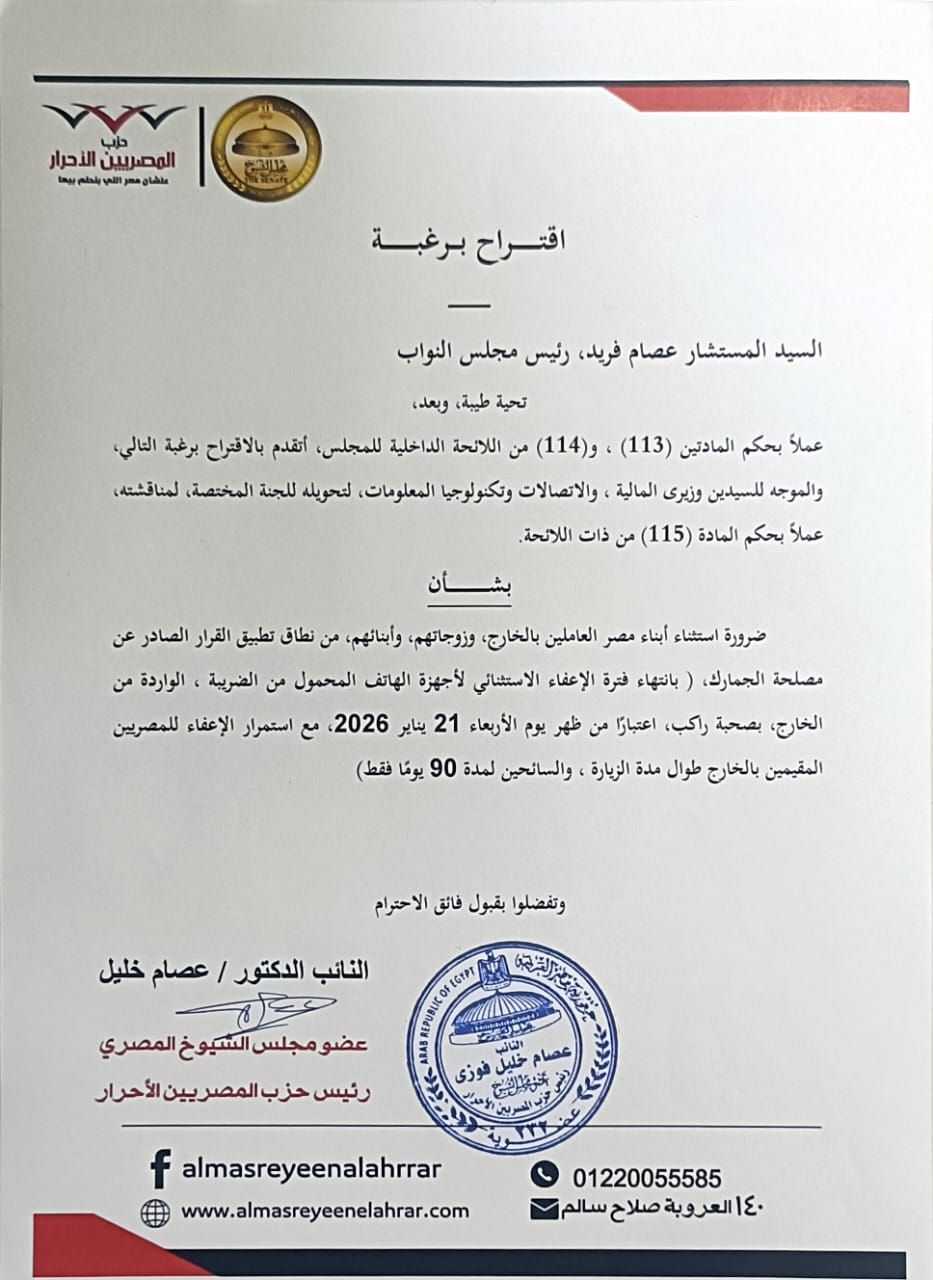 الخميس، 22 يناير 2026 04:23 متقدم النائب الدكتور عصام خليل، عضو مجلس الشيوخ ورئيس حزب المصريين الأحرار، باقتراح برغبة إلى المستشار عصام فريد، رئيس مجلس النواب، يطالب فيه باستثناء أبناء مصر العاملين بالخارج وزوجاتهم وأبنائهم من قرار مصلحة الجمارك الأخير بشأن إنهاء الإعفاء الاستثنائي لأجهزة الهاتف المحمول الواردة بصحبة الركاب.