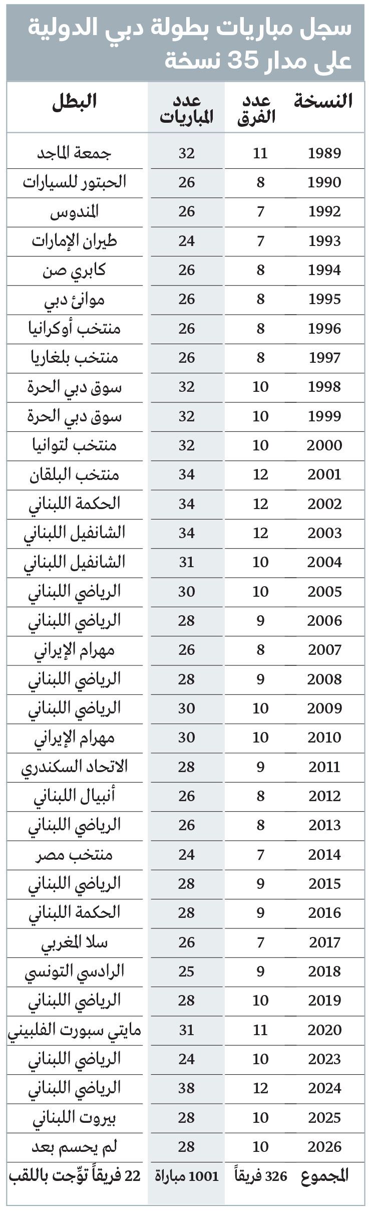 وقال رئيس اللجنة المنظمة العليا لبطولة دبي الدولية في نسختها الـ35 رئيس اتحاد كرة السلة، عبداللطيف الفردان، لـ«الإمارات اليوم»: «إن بلوغ بطولة دبي نهائي نسختها الـ35، وإقامة المباراة رقم 1001 في تاريخها، يعكس الإرث العريق والشهرة الواسعة التي تتمتع بها البطولة، والتي نجحت في ترسيخ مفاهيم إيجابية عدة، باعتبارها واحدة من أعرق البطولات القارية المدرجة تحت مظلة الاتحاد الدولي، إلى جانب مساهمتها في تطوير اللعبة عربياً وإقليمياً، في ظل الحرص الدائم من نخبة الأندية والمنتخبات الآسيوية والإفريقية على المشاركة، إضافة إلى الشعبية التي اكتسبتها من الجاليات العاشقة لكرة السلة، والتي غالباً ما تملأ المدرجات».