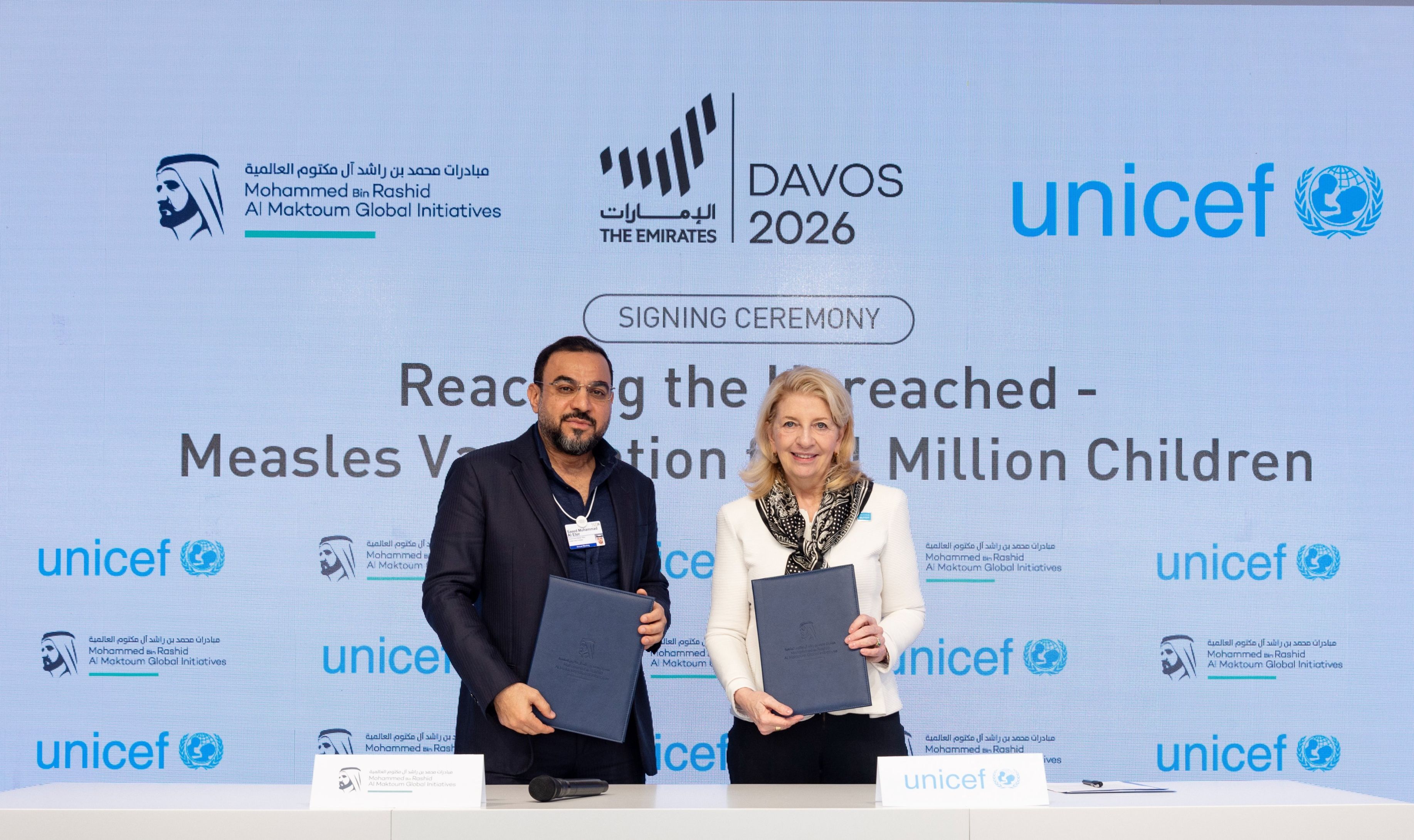 ووقع المدير التنفيذي لمؤسسة "مبادرات محمد بن راشد آل مكتوم العالمية" سعيد العطر، والمديرة التنفيذية لمنظمة الأمم المتحدة للطفولة "اليونيسف" كاثرين راسل خطاب نوايا بالشراكة بين الجانبين، تدعم بموجبه مؤسسة المبادرات "اليونيسف"، لتنفيذ برامج تطعيم شاملة ضد مرض الحصبة يستفيد منها مليون طفل.