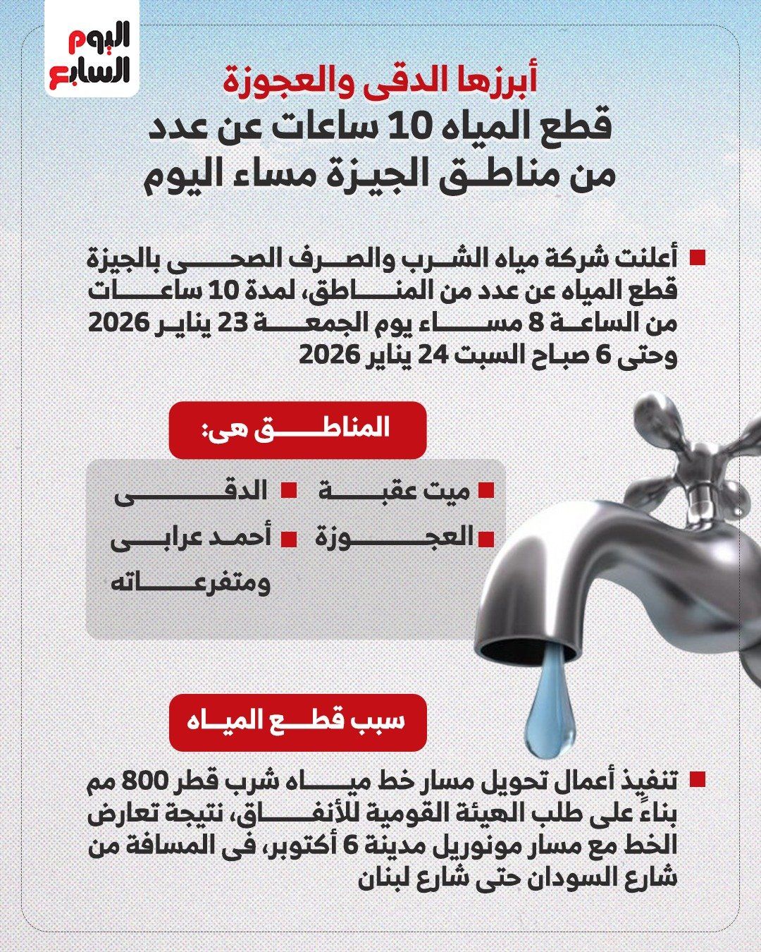 الجمعة، 23 يناير 2026 05:46 ميتساءل كثيرٌ من المواطنين بـ محافظة الجيزة عن أماكن قطع المياه اليوم، ومدة الانقطاع المتوقعة وموعد عودة الخدمة، وذلك لاتخاذ احتياطاتهم اللازمة.