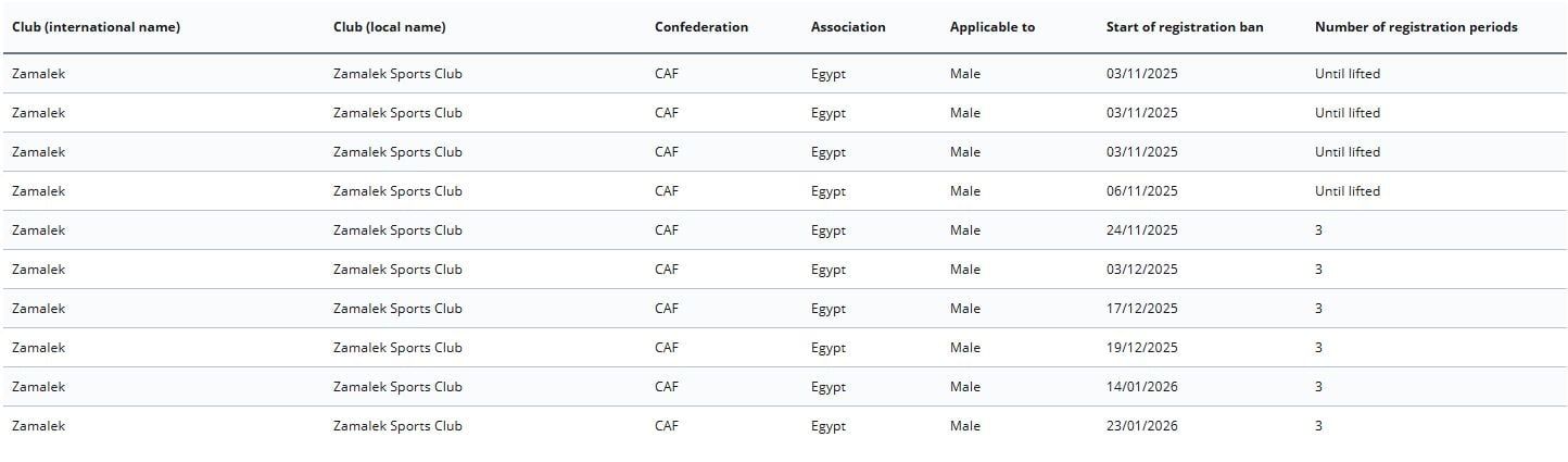 ونشر الموقع الرسمى لـ الفيفا، بتاريخ اليوم الجمعة 23 يناير، إيقاف قيد نادى الزمالك فى القضية العاشرة ولم يكشف فيفا عن هوية أو تفاصيل الأطراف المتسببة فى قرارات الإيقاف.