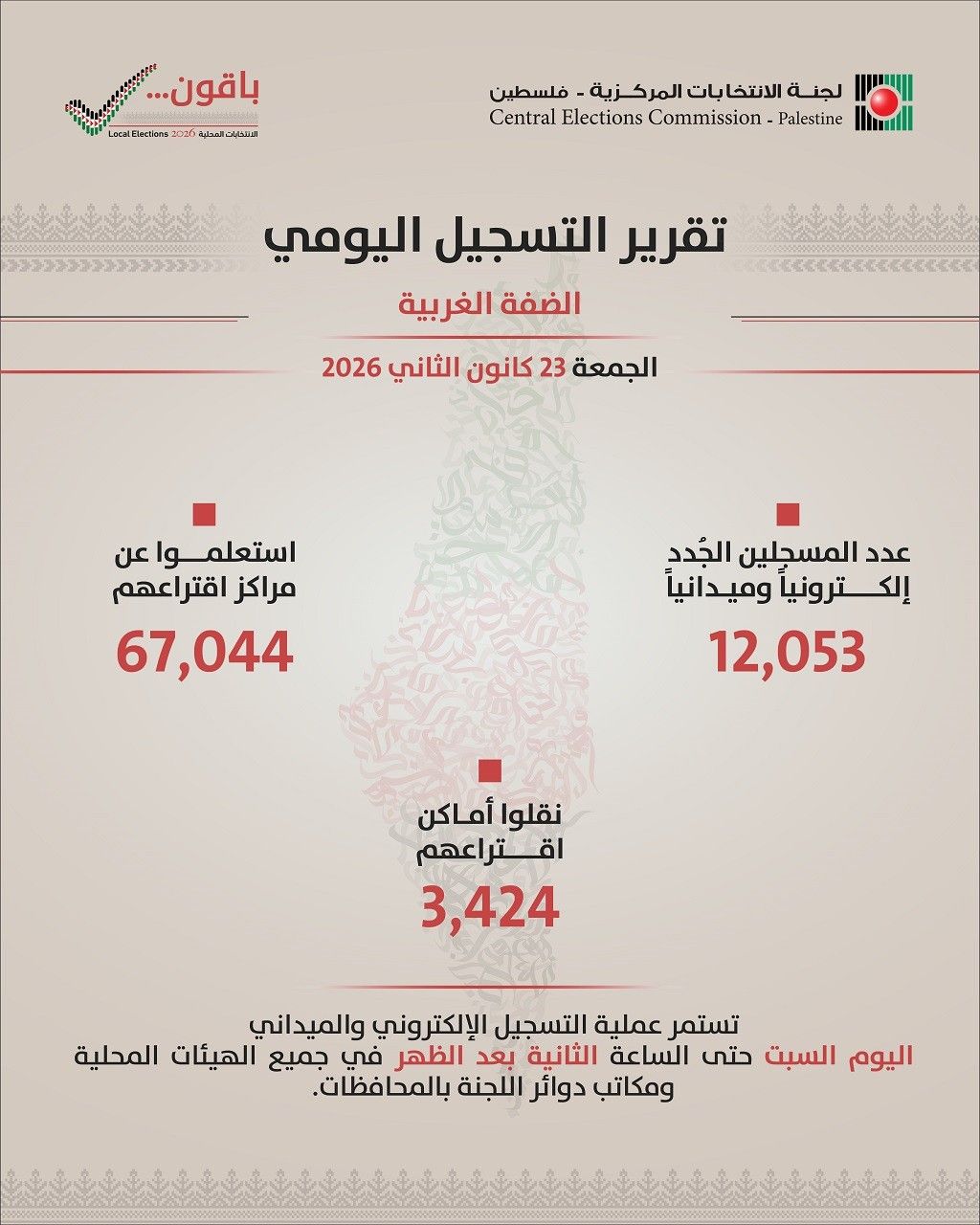 وأوضح، أن التسجيل في سجل الناخبين يغلق عند الساعة الثانية من بعد ظهر اليوم السبت.