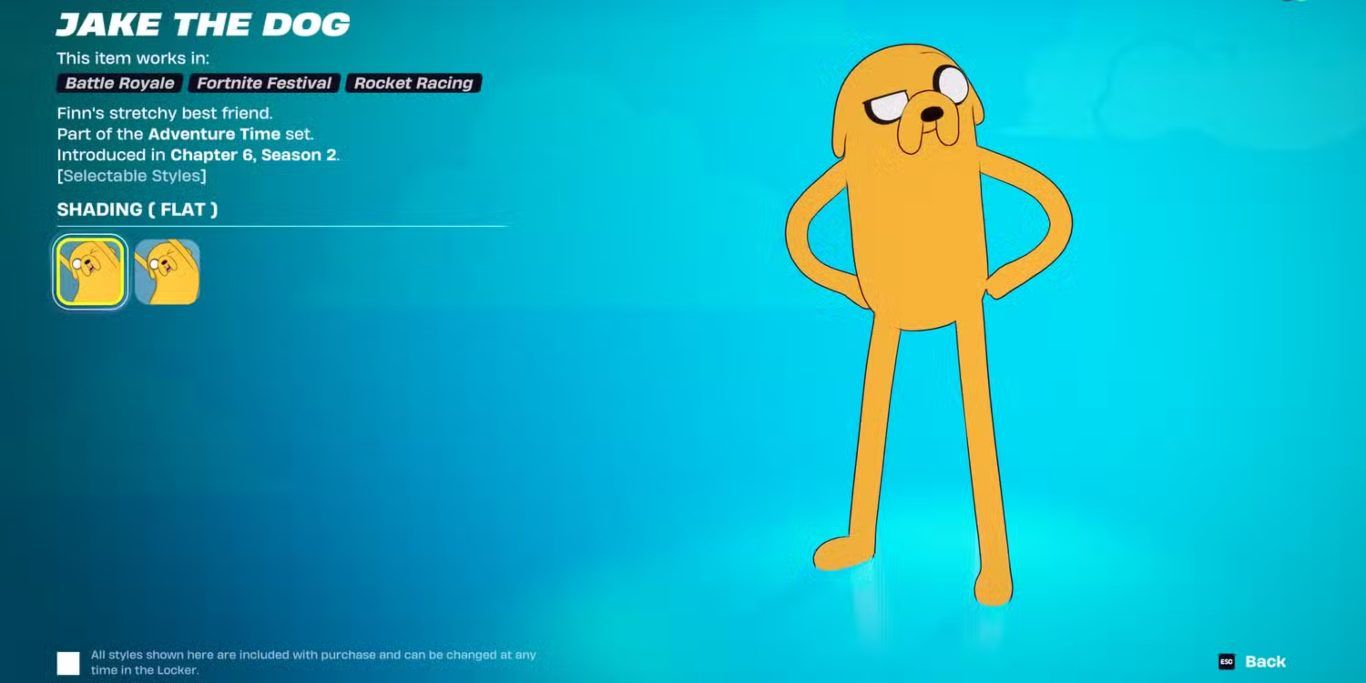 يمكن الحصول على زي Jake the Dog من متجر Fortnite مقابل 1500 V Bucks وهو السعر المعتمد لشخصيات التعاون مع Adventure Time داخل اللعبة.