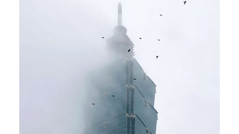 وكانت قمة برج تايبه 101 محجوبة بالغيوم، مع هطول أمطار متقطعة.
