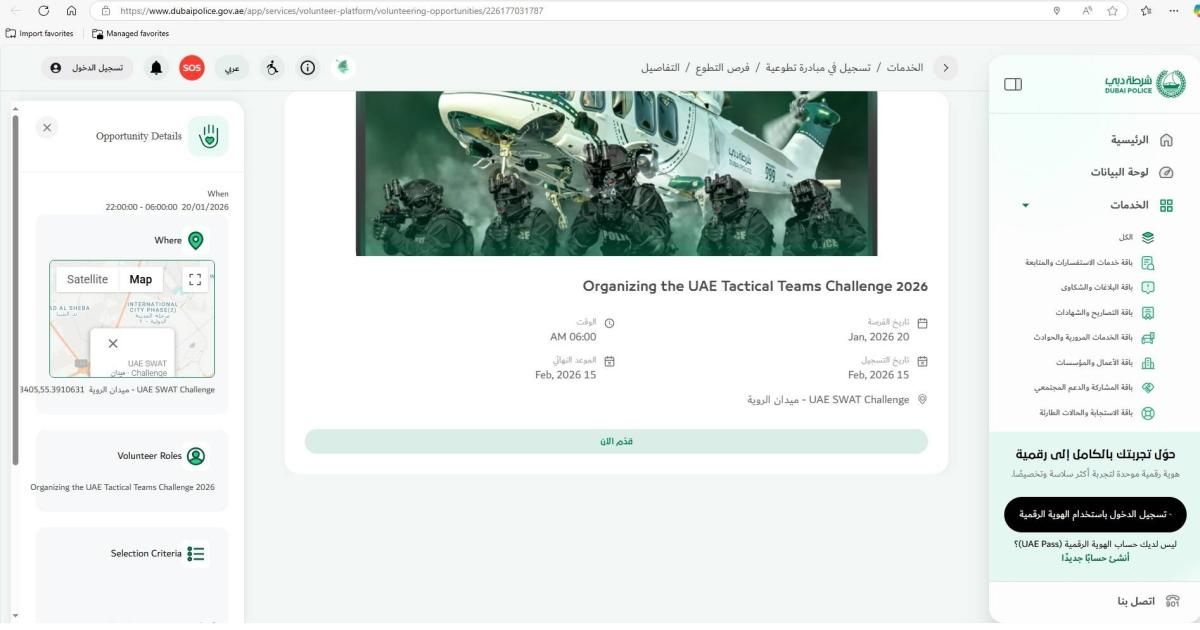 ويأتي هذا الإعلان مع توافر الفرص التطوعية، انطلاقاً من حرص شرطة دبي على تعزيز ثقافة العمل التطوعي وإشراك المجتمع في الفعاليات المهمة، ومنها تحدي الإمارات للفرق التكتيكية الذي بات من أهم التحديات التي تجمع نخب الوحدات الشرطية الخاصة وفرق التدخل السريع والفرق التكتيكية من مختلف دول العالم.