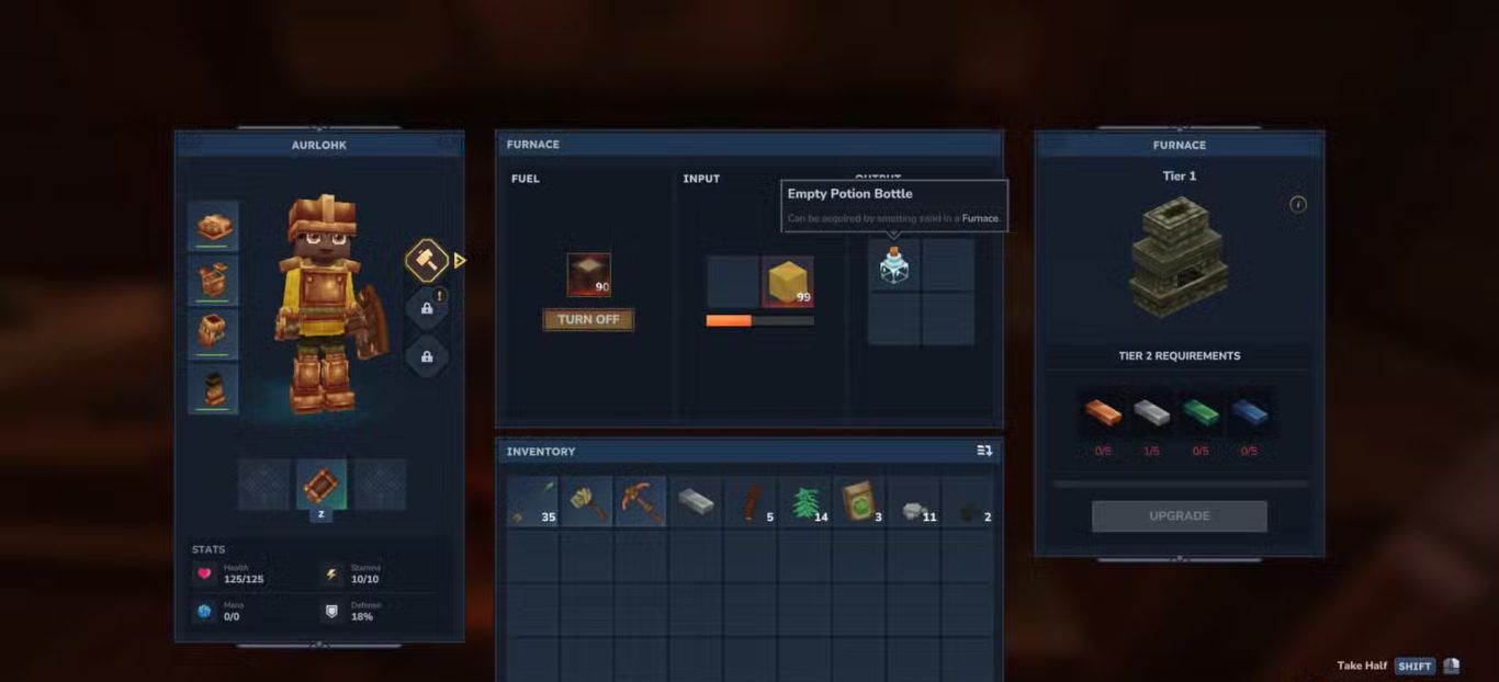 يمكن تصنيع Furnace من خلال Workbench باستخدام ستة Tree Trunks من أي نوع وستة Stones مما يجعل إنشائها متاحا نسبيا في المراحل المبكرة والمتوسطة دون الحاجة إلى موارد نادرة.