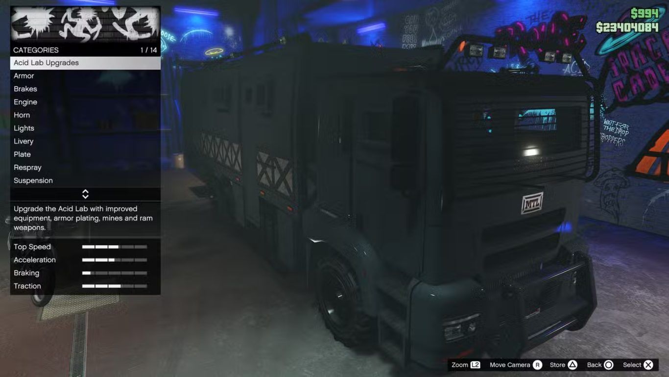 للوصول إلى أقصى كفاءة إنتاجية يجب ترقية Acid Lab من خلال الاتصال بـ Dax وتنفيذ 10 مهام Fooligan Jobs حيث تمنح كل مهمة مكافأة مالية قدرها 50000 دولار وبعد إكمال جميع المهام المطلوبة يصبح بالإمكان دفع 750000 دولار لترقية المختبر مما يؤدي إلى زيادة سرعة الإنتاج ورفع قيمة Acid النهائي عند البيع.