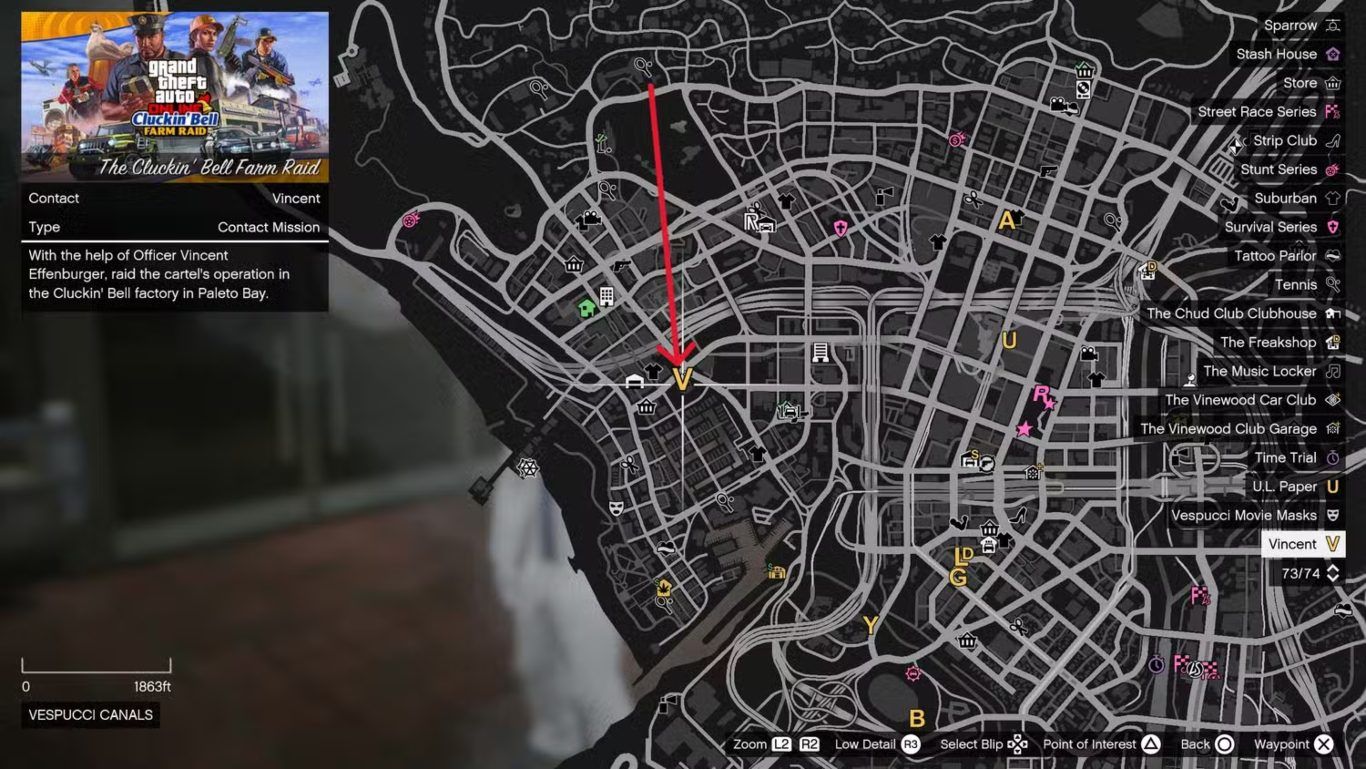 عند فتح الخريطة داخل لعبة GTA Online سيلاحظ اللاعب وجود علامة V ذهبية بالقرب من Vespucci Police Station في منطقة Vespucci Canals داخل مدينة Los Santos حيث يؤدي التوجه إلى هذا الموقع إلى بدء أول مهمة تواصل مع Officer Vincent Effenburger وهي الخطوة الأساسية التي تفتح سلسلة مهام Cluckin Bell Farm Raid بشكل كامل.