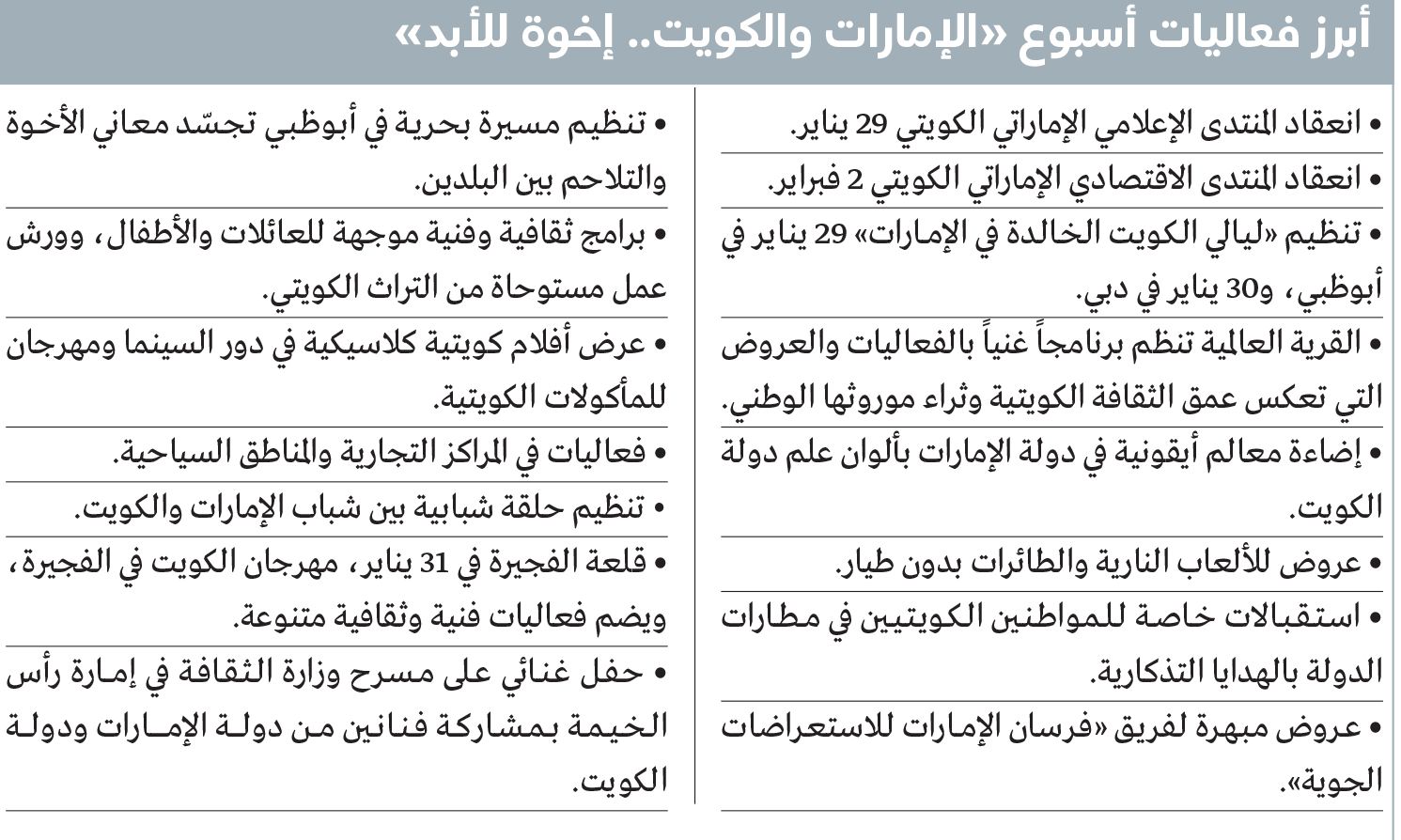 ويشهد أسبوع «الإمارات والكويت إخوة للأبد» في إمارة دبي، تنظيم فعالية «ليالي الكويت الخالدة في الإمارات» يوم 30 يناير الجاري في برج بارك - البوليفارد بدبي، وتتضمن حفلاً غنائياً وفنياً بمشاركة نخبة من نجوم الغناء في دولة الإمارات ودولة الكويت، وهم: حسين الجسمي، ومطرف المطرف، وبلقيس، وخالد المظفر. كما سيتم تنظيم الفعالية الثقافية الفنية «الكويت في دارها» في جميرا كايت بيتش والتي تستمر من 29 يناير حتى 4 فبراير، وتتضمن مساحة مفتوحة بإطلالة بحرية تجمع الموسيقى والعروض الحية والمأكولات في تجربة معاصرة تبرز الثقافة الإماراتية والكويتية.