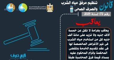عرض مواد القانون وأكد رئيس مياه سوهاج، أنه سيتم عرض مواد القانون وأهم العقوبات التى تترتب على عدم الالتزام بتطبيق مواد القانون والذى من المقرر تطبيقه فى مارس من العام الجارى وذلك بهدف توعية المواطنين وتعريفهم لتجنب تطبيق تلك العقوبات عليهم.