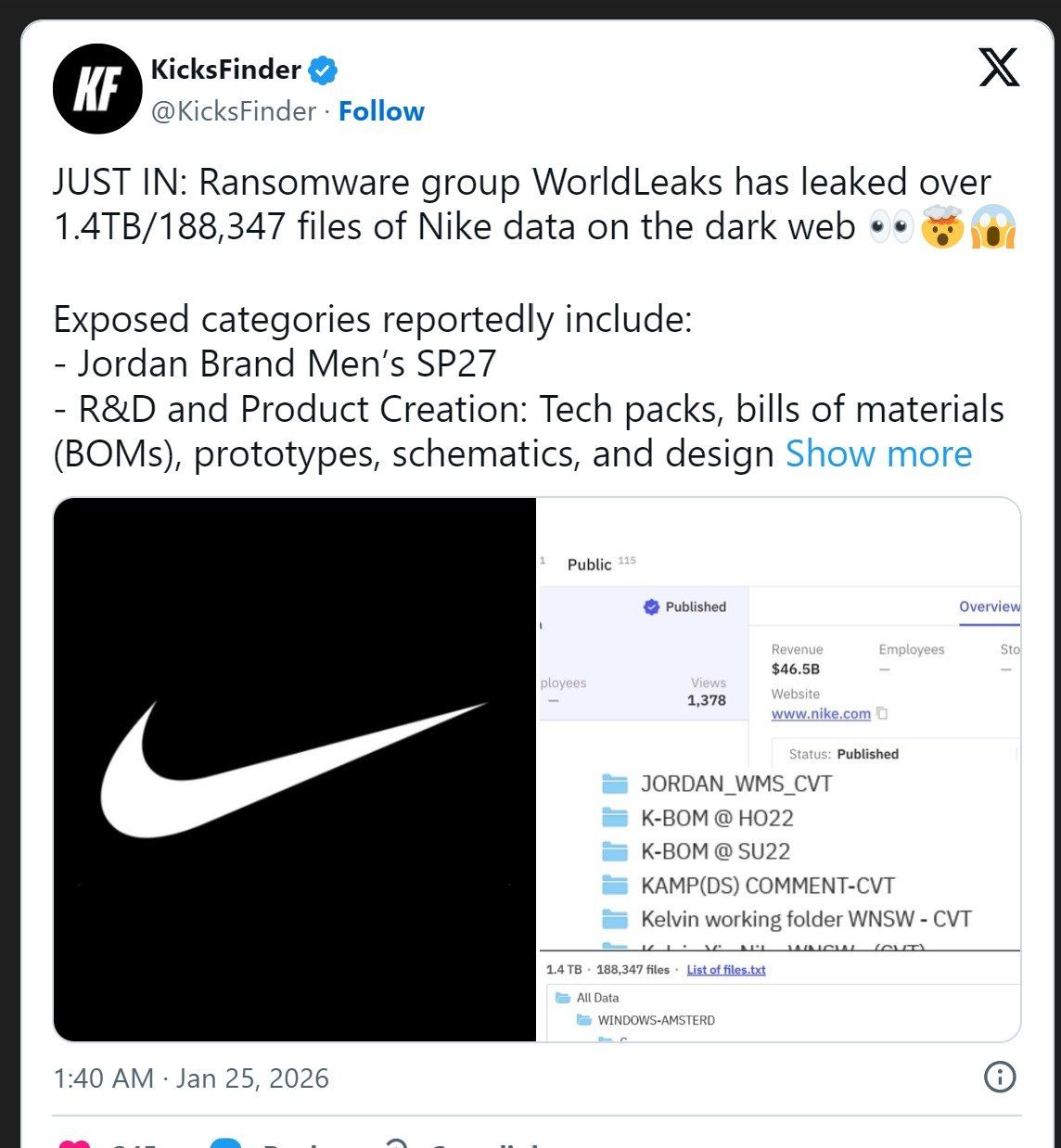 ويشمل الاختراق أكثر من 188 ألف ملف، تتضمن مخططات تصميمية لمنتجات "Jordan Brand" لعام 2027، وتفاصيل سلاسل التوريد، بالإضافة إلى وثائق تدريب الموظفين وعروض تقديمية استراتيجية من عام 2020 وحتى عام 2026.