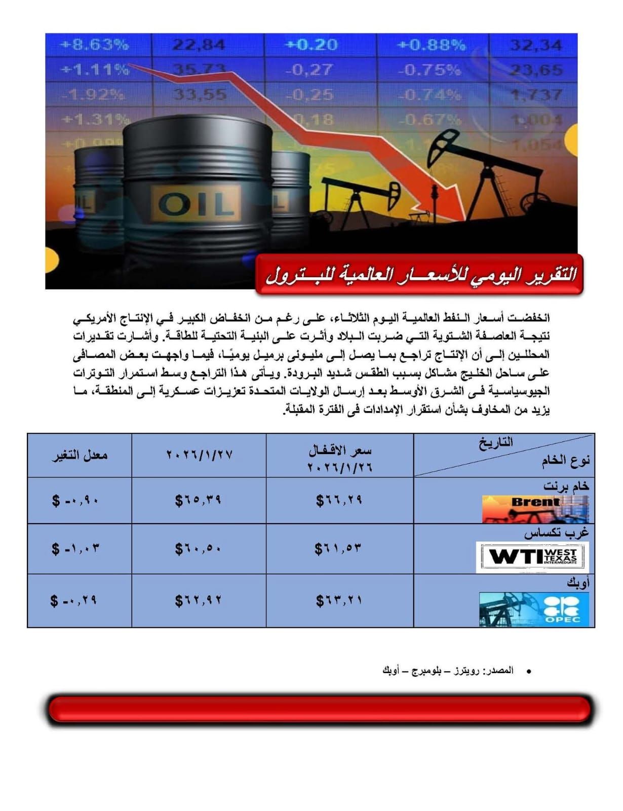 وأشار التقرير اليومى للأسعار العالمية للبترول، انخفاض أسعار النفط العالمية اليوم الثلاثاء، على رغم من انخفاض الكبير في الإنتاج الأمريكي نتيجة العاصفة الشتوية التي ضربت البلاد وأثرت على البنية التحتية للطاقة.