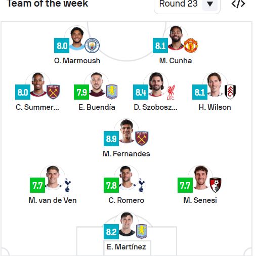 ضمت التشكيلة المثالية كل من، عمر مرموش – ماتيوس كونيا – كريسينسيو سامر – إميليانو بوينديا – دومينيك سوبوسلاي – هاري ويلسون – ماتيوس فيرنانديز – فان دي فين – كريستيان روميرو – ماركوس سينيسي – إيميليانو مارتينيز.