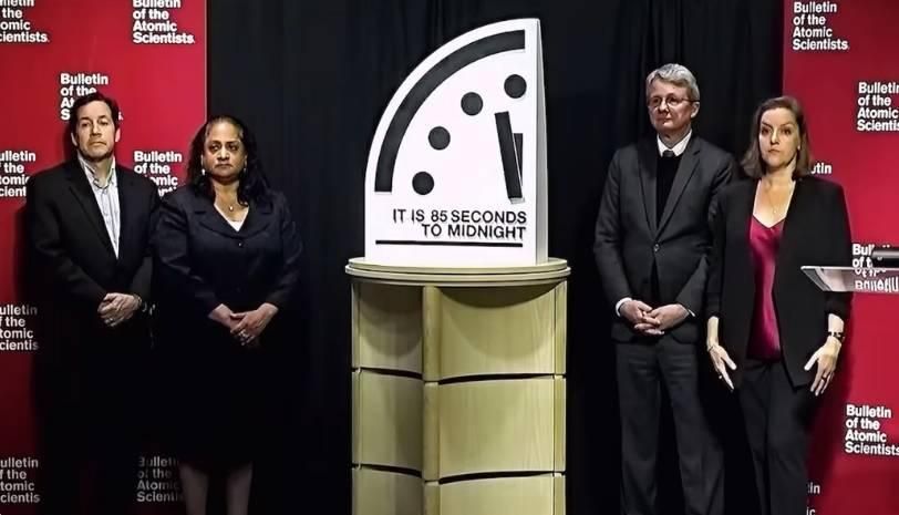 ضَبَطَ علماء الذرة «ساعة يوم القيامة» لتصبح عند 85 ثانية فقط قبل منتصف الليل، وهو أقرب وقت تصل فيه البشرية إلى نقطة الفناء النظري منذ تأسيس الساعة عام 1947 من قِبَل «ألبرت أينشتاين» و«جي روبرت أوبنهايمر» ورفاقهما، عقب الحرب العالمية الثانية، لتظل صرخة تحذيرية مستمرة تذكر العالم بمدى اقترابه من تدمير نفسه، محذرين من «فشل عالمي في القيادة» يضع الكوكب على حافة الكارثة.