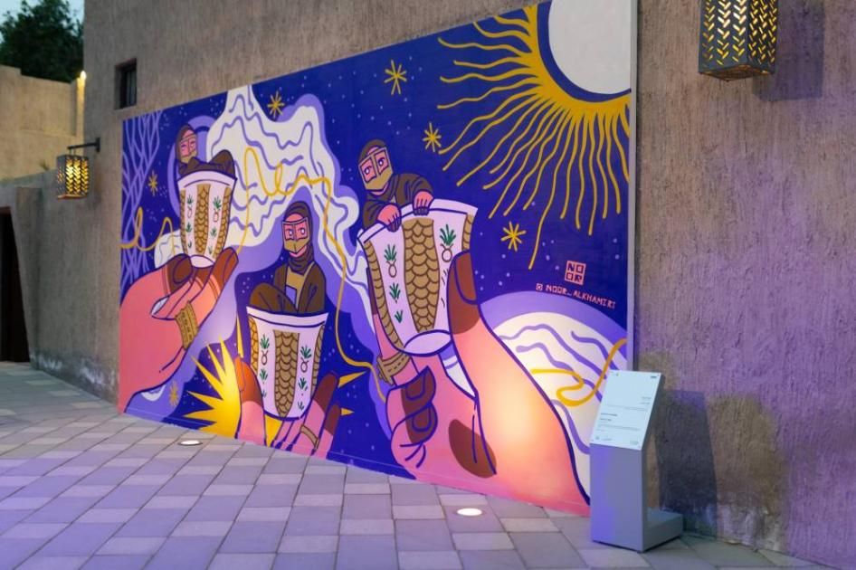 واستلهمت الكويتية نورة الصباح جداريتها «أدر الريشة، غنِّ للريح» من حركة الطيور والنباتات، لتقدم قراءة معاصرة للثقافة تستكشف من خلالها العلاقة بين الطبيعة والحِرفة ودور المرأة في منطقة الخليج. وسعت فاطمة (فَيْ) الكعبي وعائشة الكعبي عبر جداريتهما «نسجَت الشمس في القلب» إلى تقديم تصور للمجلس بوصفه مساحة للذاكرة والكرم والضيافة، فيما قدمت نورة الخميري جدارية «أكواب الزمن»، التي تنسج فيها بين خيوط التراث والأنوثة والزمن، في تعبير بصري يجسد الحكمة والذاكرة واستمرارية الأجيال، ما يعكس أهمية دور الكبار في المجتمع المحلي.