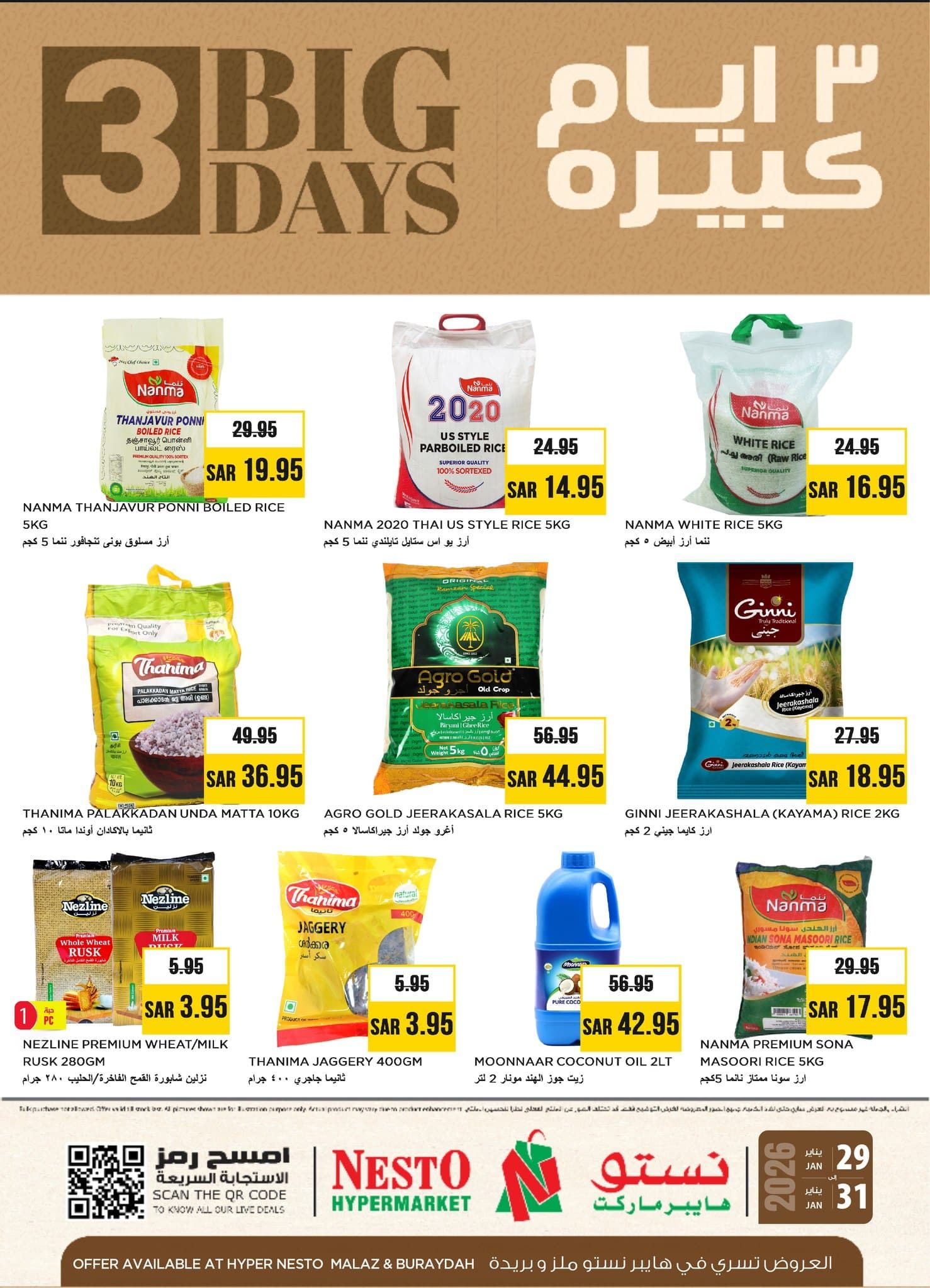 نستو الملز الويكند الخميس 29-1-2026 الموافق 10 شعبان 1447هـ و تحتوي علي بابايا جيزان وموز أصفر وموز راسكادالي وقرع كايو وموز أخضر وأعواد خضروات وقرع هندي وفاصوليا عنقودية وخيار ذهبي وعنب الثعلب بالإضافة إلى أرز مسلوق بوني وأرز تايلاندي وغيرها من المنتجات باقل الاسعار المناسبة للجميع