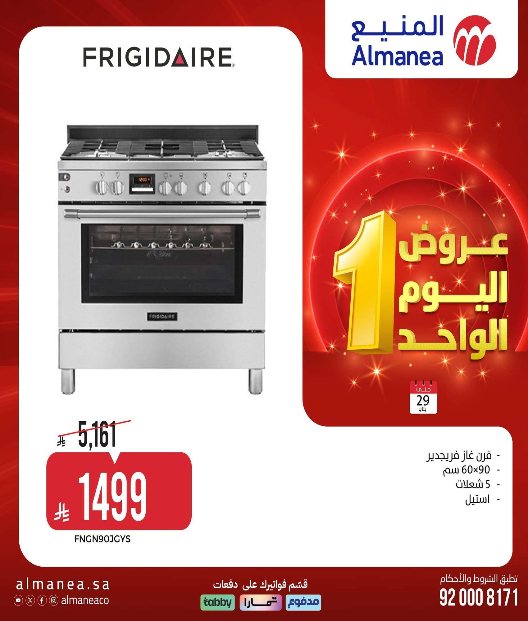 - فرن غاز فريجيدير 60×90 سم 5 شعلات استيل 1499 ريال