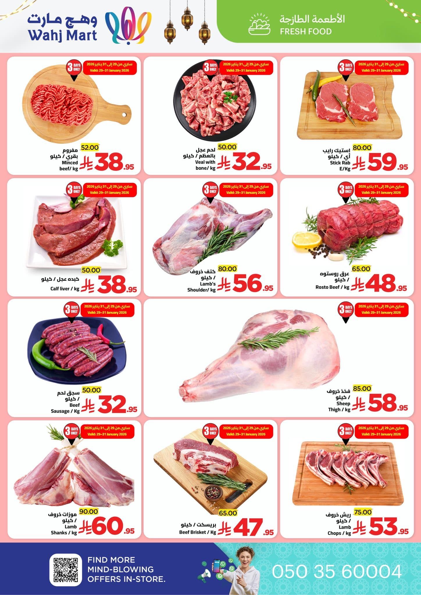 عروض وهج مارت جدة الخميس 29-1-2026 الموافق 10 شعبان 1447هـ و تحتوي علي اللحوم مثل الموزات والريش والكتف إلى جانب اللحم البقري والعجل والكبدة والسجق كما يوفر قسم الأجبان خيارات عالمية مثل البارميزان الإيطالي والقشقوان والإيدام الهولندي والتشيدر بالإضافة إلى الفواكه والخضروات الشهية و باسعار تنافسية .