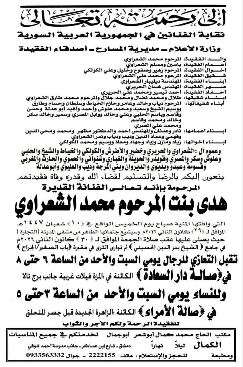نعت نقابة الفنانين في سوريا، الفنانة هدى شعراوي، التى رحلت عن عالمنا بعد واقعة مقتلها، وكشفت النقابة عن موعد الجنازة والعزاء، حيث يشيع جثمانها اليوم الجمعة، من مشفى المدينة ويصلي عليها عقب صلاة الجمعة من مسجد الشيخ بدر الدين الحسيني، وتوارى الثرى في مقبرة باب الصغير.