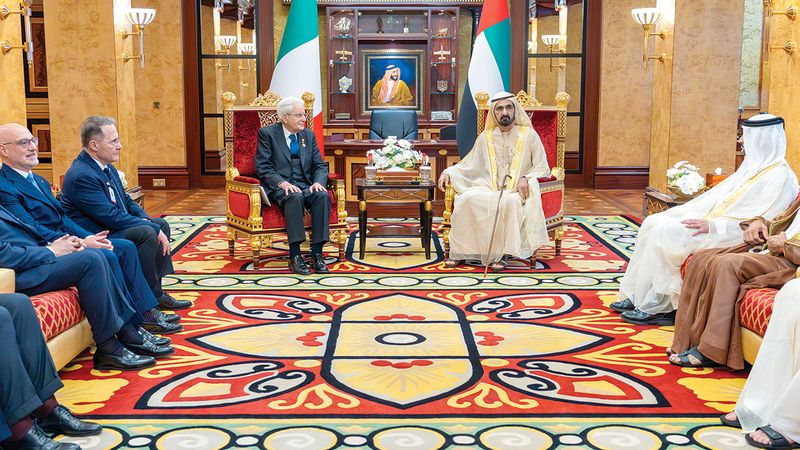 ورحّب صاحب السموّ الشيخ محمد بن راشد آل مكتوم بالرئيس الضيف، مؤكداً عمق العلاقات التاريخية والاستراتيجية التي تجمع دولة الإمارات وجمهورية إيطاليا، وما تشهده من تطور مستمر في مختلف المجالات، في ضوء رؤية قيادتَي البلدين القائمة على تعزيز الشراكة البناءة، وتبادُل الخبرات، بما يخدم تطلعات الشعبين نحو مزيد من التقدم والازدهار.