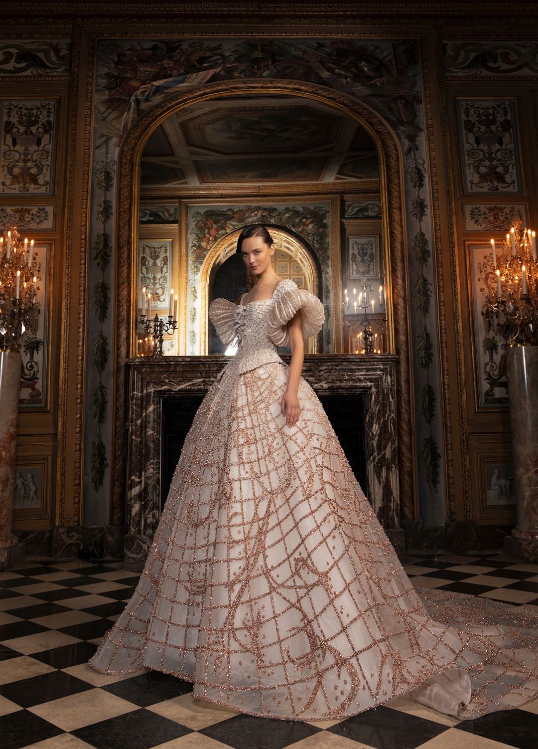قدّم المصمم زياد نكد فستان زفاف وكأنه خارج من عالم الأساطير، حيث اعتمد على قصّة كورساج أنثوية تبرز الخصر، تنسدل بعدها تنورة منفوشة بقصّة السندريلا الكلاسيكية. الأكمام المنفوشة جاءت بطريقة دراماتيكية حالمة، بينما أضفت التطريزات النحاسية الفاخرة طابعًا ملكيًا على التصميم، لفستان مثالي للعروس الرومانسية التي تحلم بإطلالة تشبه حكايات الخيال في يومها الكبير.
