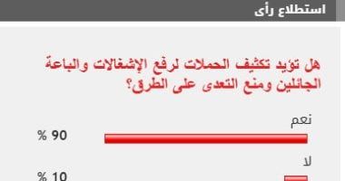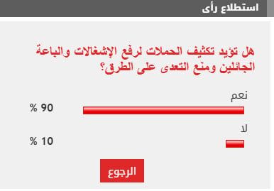 وأيد 90% من القراء مطالب تكثيف الحملات لرفع الإشغالات والباعة الجائلين ومنع التعدى على الطرق، بينما عارض 10% من القراء مطالب تكثيف الحملات لرفع الإشغالات والباعة الجائلين ومنع التعدى على الطرق.