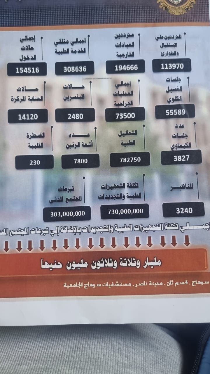 وأكدت مستشفيات سوهاج الجامعية أن إجمالي تكلفة التجهيزات الطبية والمصروفات بالإضافة إلى تبرعات المجتمع المدني بلغت مليارًا وثلاثة وثلاثين مليون جنيه، تم توجيهها بالكامل لخدمة المرضى والارتقاء بالمنظومة الصحية داخل المحافظة.