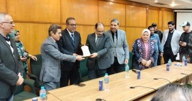 وفى نهاية الندوة فتح حوار مع الحضور وأجاب على كل الأسئلة وأهدى عميد كلية الطب اللواء وليد السيسي درع الجامعة