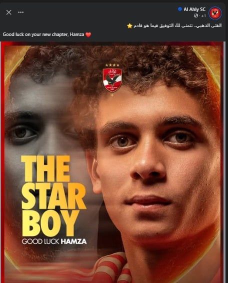 نشرت الصفحة الرسمية للنادى الأهلى على موقع التواصل الاجتماعى فيس بوك صورة لـ حمزة عبد الكريم مهاجم الفريق المعار إلى نادى برشلونة الإسبانى لمدة 6 أشهر، مصحوبة بتعليق: "الفتى الذهبي.. نتمنى لك التوفيق فيما هو قادم".