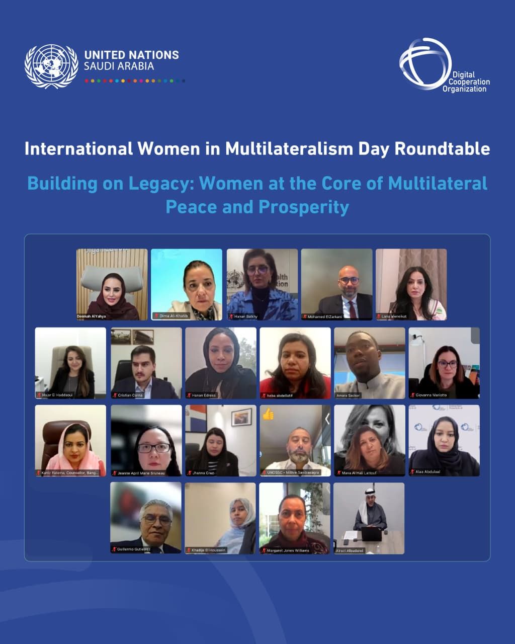 عقدت منظمة التعاون الرقمي، بالتعاون مع الأمم المتحدة في المملكة العربية السعودية، اجتماع مائدة مستديرة افتراضية رفيعة المستوى بمناسبة اليوم الدولي للمرأة في العمل المتعدد الأطراف، تحت شعار: "بناءً على الإرث: المرأة في صميم السلام والازدهار المتعدد الأطراف".