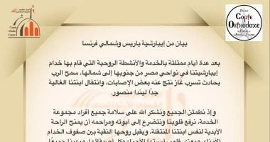 وأكدت الإيبارشية، في بيانها الصادر الأحد 1 فبراير 2026 الموافق 24 طوبة 1742ش، على روح الإيمان والرجاء، مشددة على استمرار الصلاة من أجل المصابين وسلامتهم الكاملة.