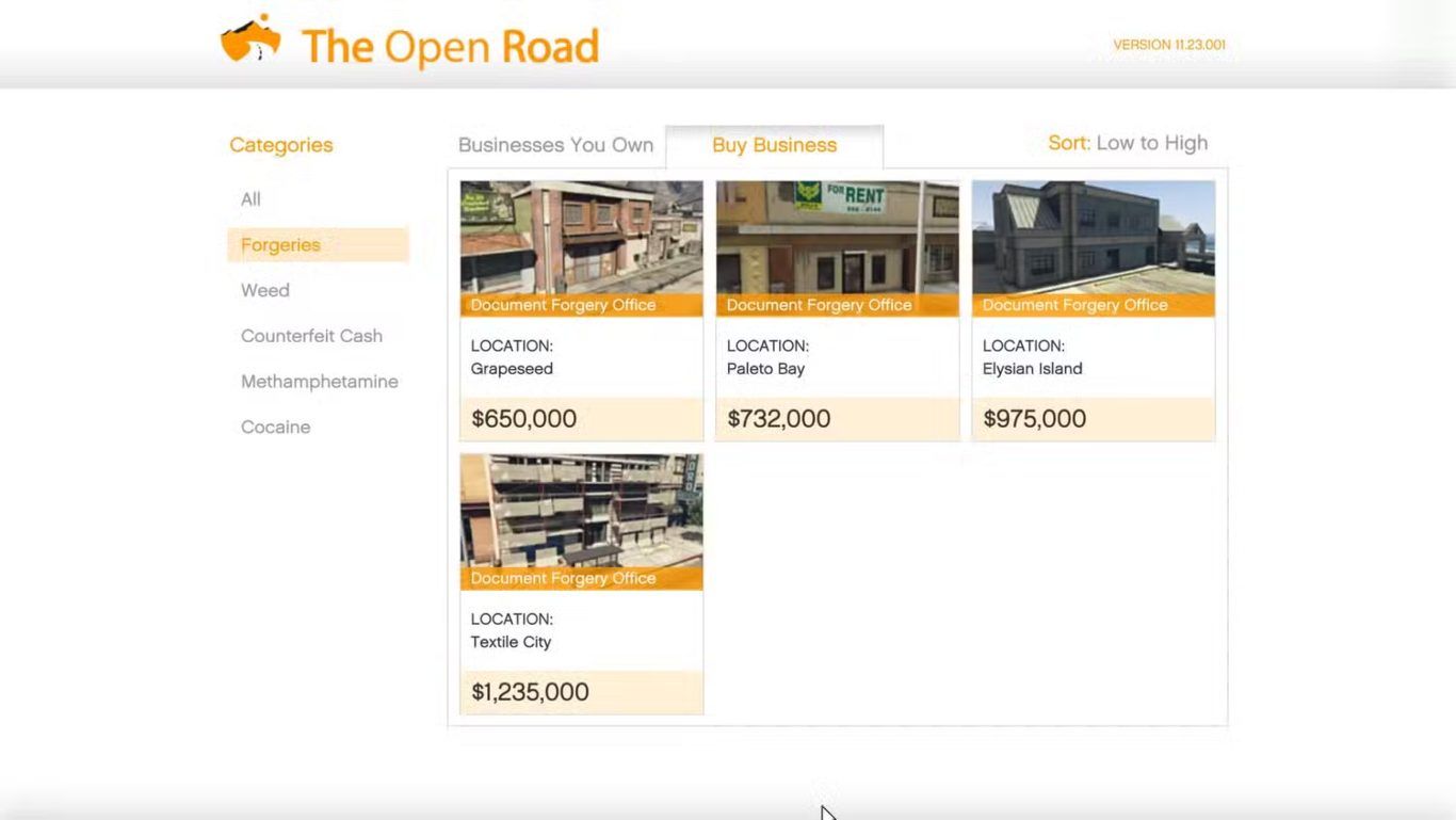يتم شراء مكتب تزوير الوثائق من خلال MC Clubhouse Computer وهو مصنف ضمن MC Businesses التي تعتمد على الإنتاج البطيء والبيع الدوري. المشكلة الأساسية في هذا النشاط أن الأرباح الناتجة عنه ضعيفة للغاية حتى بعد ترقية جميع المرافق والمعدات المتاحة. يحتاج اللاعب إلى عشرات الساعات من اللعب الفعلي فقط ليصل إلى نقطة استرداد رأس المال وهو أمر غير منطقي مقارنة بالبدائل الأخرى.