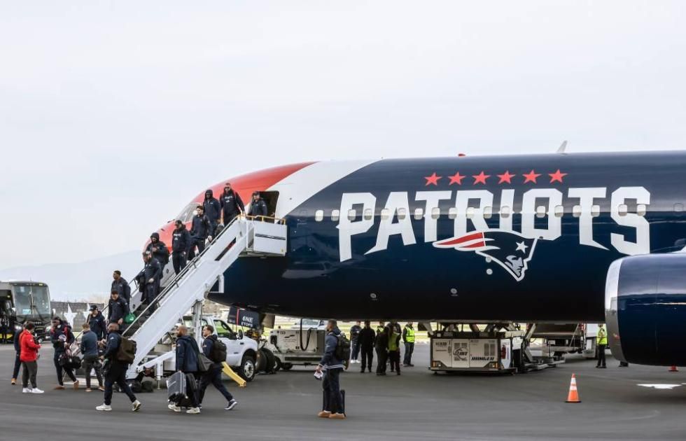 حطت طائرة نيو إنغلاند باتريوتس في مطار سان هوزيه مينيتا في الساحل الغربي للولايات المتحدة الأمريكية لبدء التحضيرات لخوض السوبر بول ( نهائي دوري كرة القدم الأمريكية ) أمام سياتل سيهاوكس الأسبوع المقبل.